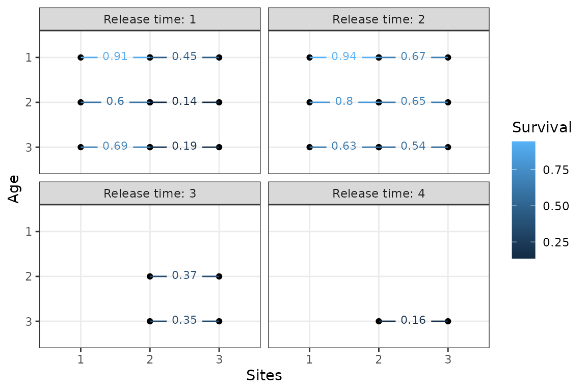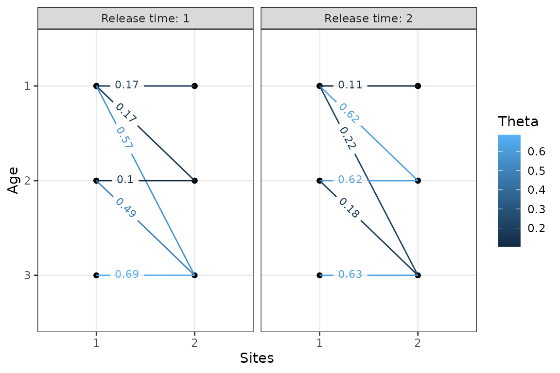 To briefly describe the purpose of these models and when then would be useful, space-for-time substitutions are frequently used in mark-recapture models for animals that migrate along a fixed path. Instead of repeated observations over time, there are observations of individuals as they pass fixed stations or sites. This is not a perfect substitution, because the amount of time it takes individuals to move between sites can vary. This model incorporates time and individual ageclass into the space-for-time framework. Here, ageclasses are with respect to time, so they are ages rather than stages like “juvenile” or “adult”.